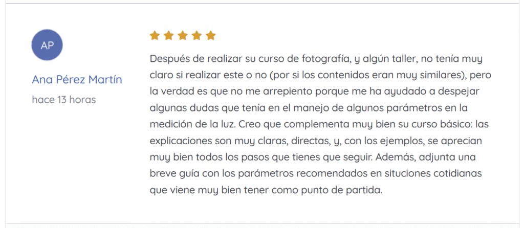 El resto de cursos se centran en explicar cómo funciona cada parámetro, pero no te dan un método a seguir, no te explican cómo interpretar la luz que mide tu cámara, ni te da unos pasos sencillos para obtener la mejor exposición posible en cuestión de segundos.